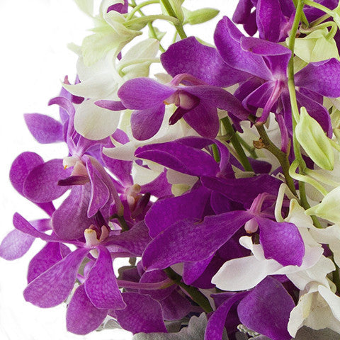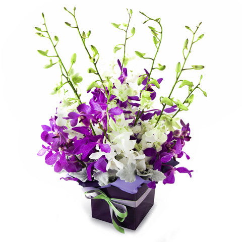 Offer your deepest sympathy to someone grieving the loss of a loved one with a gorgeous box arrangement of purple and white orchids. This elegant arrangement can be delivered to someone’s home, or the memorial or funeral service with a message of peace and your sincere condolences. Pre-ordering (2-3 days before) is highly recommended. Arrangement contains appr. 10-12 stems of Dendrobium and Vanda orchids.