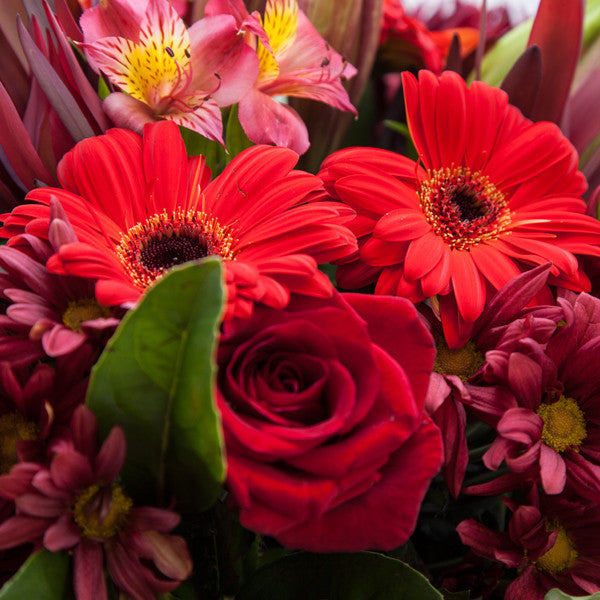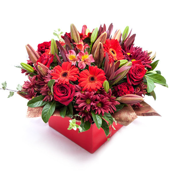 Celebrate any special occasion with this vibrant arrangement in all shades of red. The tones of rich scarlet roses, lilies and chrysanthemums are just astonishing. It is a gift that will surely endure in the memory!