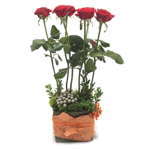 6 red roses standing in a ceramic vase (16 cm H x 16cm L x 8cm W) is a modern and fashionable way of presenting the traditional half dozen. A gift of love, perfect for your special someone.