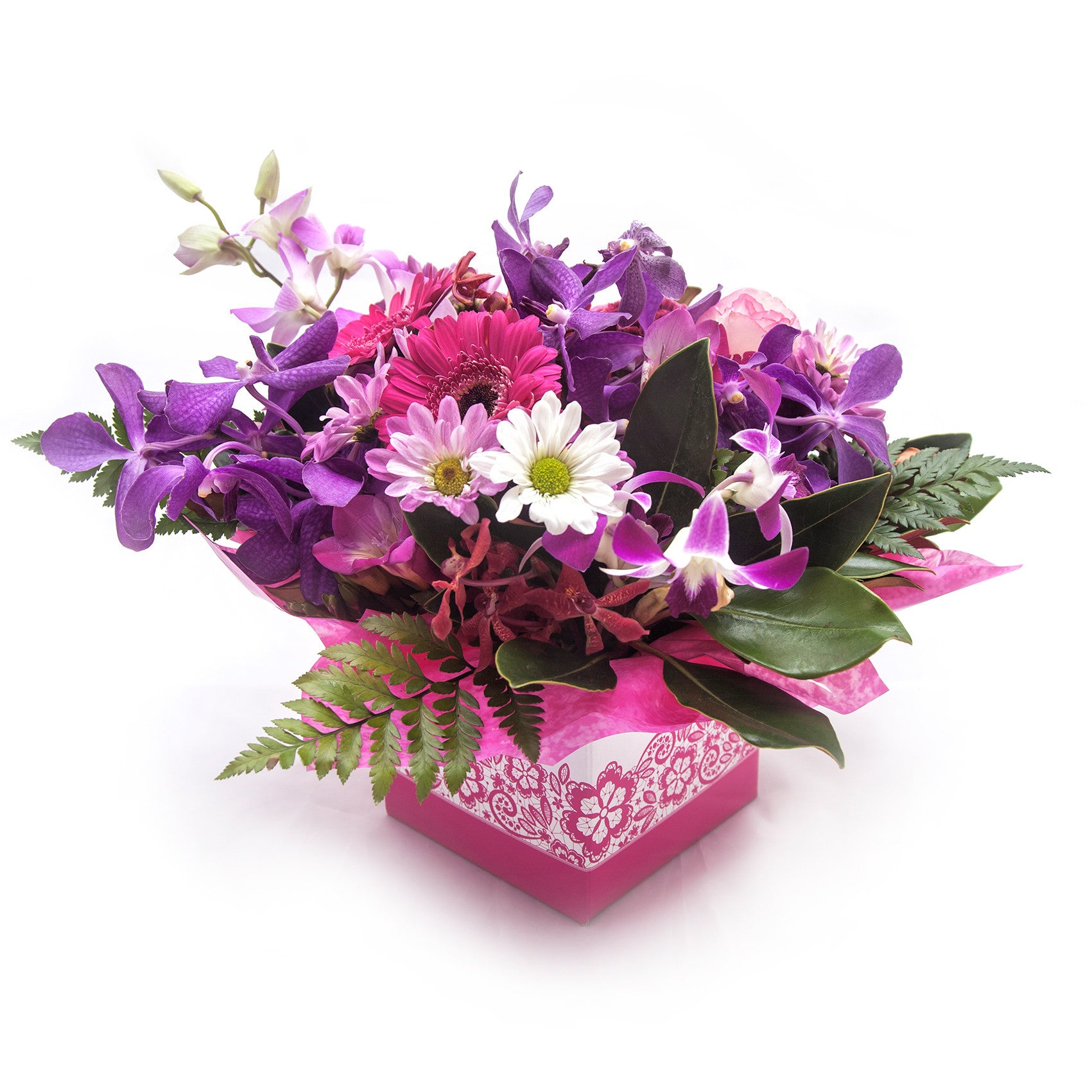 This feminine mini box arrangement of seasonal fresh flowers in pinks and purples will be sure to bring a smile to the face of any lucky person.