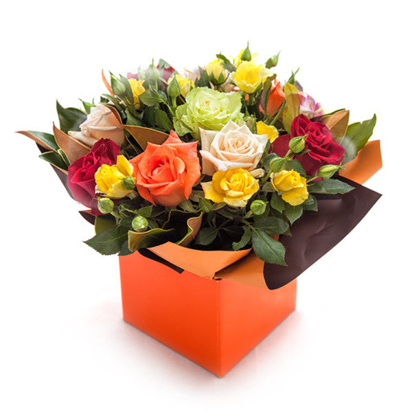 An assortment of beautiful fresh roses, arranged into a box. The rose colours may vary from the image, depending on availability and stock.